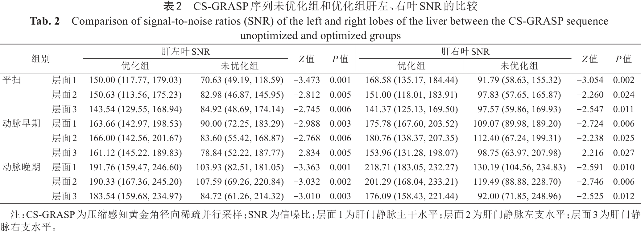 表2  CS-GRASP序列未优化组和优化组肝左、右叶SNR的比较