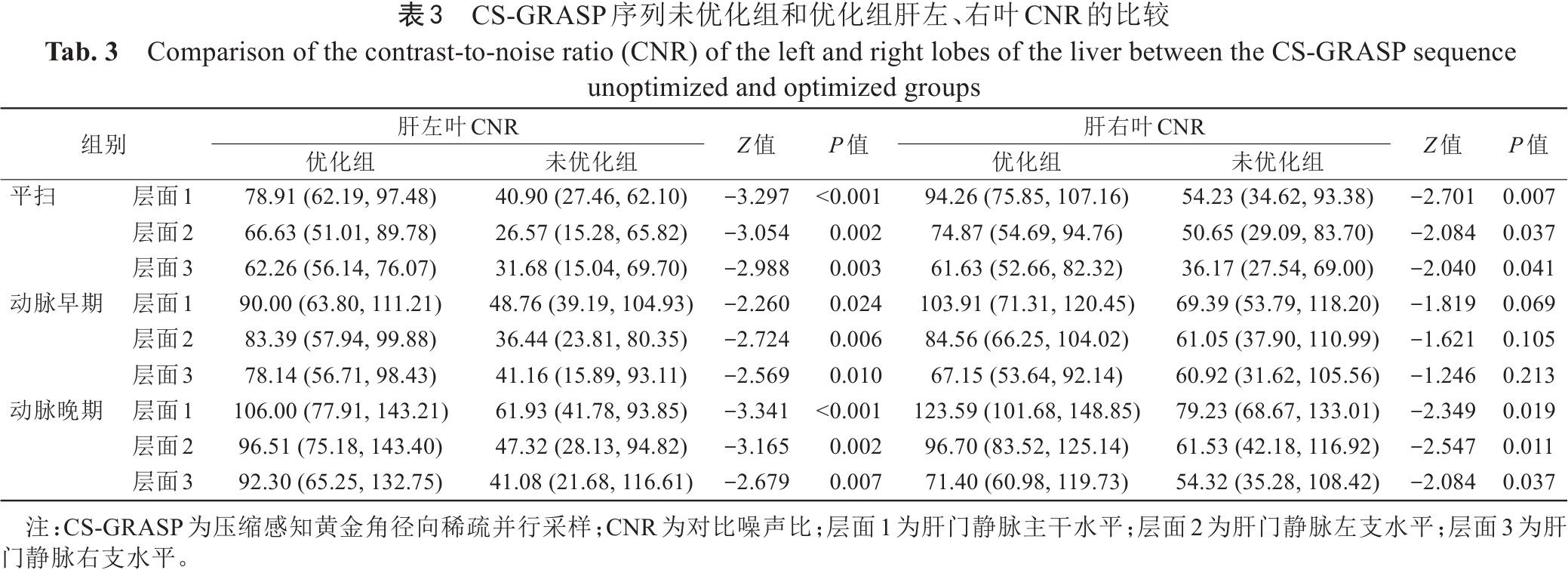 表3  CS-GRASP序列未优化组和优化组肝左、右叶CNR的比较