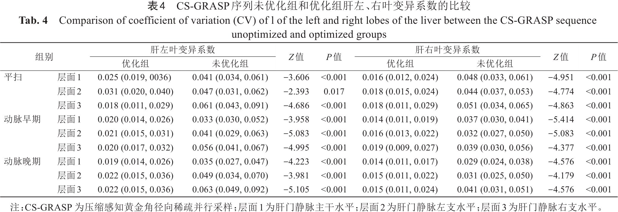 表4  CS-GRASP序列未优化组和优化组肝左、右叶变异系数的比较