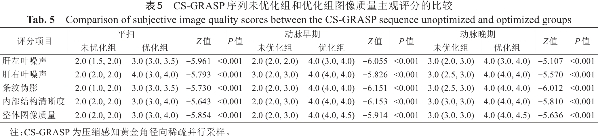 Tab. 5  Comparison of subjective image quality scores between the CS-GRASP sequence unoptimized and optimized groups