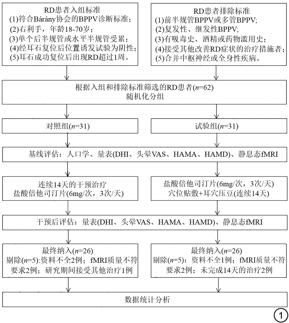 据报道,RD症状的持续时间从几周到几个月不等,可引起情绪及睡眠障碍,并增加跌倒风险[8, 9]。部分患者可发展为继发性的持续性姿势-知觉性头晕(persistent postural-perceptual dizziness, PPPD),表现为持续非旋转性头晕和(或)不稳,并伴有显著的焦虑抑郁或功能障碍[10, 11, 12]。因此,如何有效管理BPPV患者的RD症状非常重要。然而,对于如何有效管理BPPV患者在成功复位后发生的RD症状,尚未形成一致的意见。前庭康复训练可以有效改善BPPV成功复位后的RD症状,但不同患者的疗效差异很大,有些患者的症状改善并不明显[13, 14]。药物治疗(例如倍他司汀、抗焦虑药物、曲美他嗪、银杏叶提取物以及丹红等)在RD的临床疗效方面仍然不明确[15, 16, 17]。既往研究认为,中医特色疗法如穴位贴敷与耳穴压豆在治疗头晕方面可能具有良好的效果,但其对RD的临床疗效仍然不明确[18, 19]。因此,本研究首先观察穴位贴敷联合耳穴压豆疗法在RD患者中的临床疗效。此外,既往利用功能磁共振成像(functional magnetic resonance imaging, fMRI)技术探索RD发生机制的研究表明,BPPV成功复位后出现的RD症状可能与某些脑区低频振幅(amplitude of low-frequency fluctuations, ALFF)发生改变有关[20, 21]。ALFF主要用于检测脑区自发活动的强度,ALFF值越高,表明脑区自发活动越强。然而,ALFF对生理噪声非常敏感,用ALFF与全部频率的功率谱均方根的比值可以得到分数低频振幅(fractional amplitude of low frequency fluctuation, fALFF)。fALFF可明显降低ALFF对生理噪声的敏感性,并提升其检测自发脑功能活动的敏感性和特异性[22]。因此,本研究还将利用静息态fMRI技术,采取fALFF分析方法,探讨穴位贴敷联合耳穴压豆疗法对RD患者自发脑功能活动的影响。