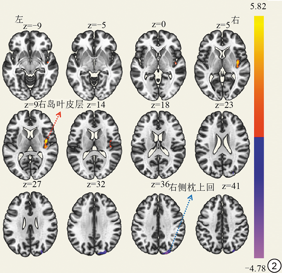 图2  试验组患者治疗前后分数低频振幅(fALFF)发生改变的脑区部位(P<0.05, FDR校正)。图中红黄色区域代表试验组患者治疗后fALFF增强的脑区部位,蓝紫色区域代表试验组患者治疗后fALFF减弱的脑区部位,右侧色条代表t值。
