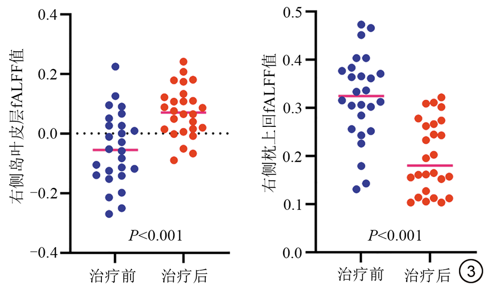 图3  试验组患者治疗前后分数低频振幅(fALFF)值变化情况。
