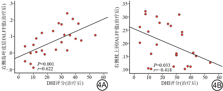 Fig. 4  Correlation analysis between imaging and clinical features. 4A: The DHI score of the patients in the experimental group after treatment was positively correlated with the fractional amplitude of low-frequency fluctuation (fALFF) of the right insular cortex (r = 0.622,P = 0.001); 4B: The DHI score of the patients in the experimental group was negatively correlated with the fALFF of the right superior occipital gyrus (r = -0.418,P = 0.033).