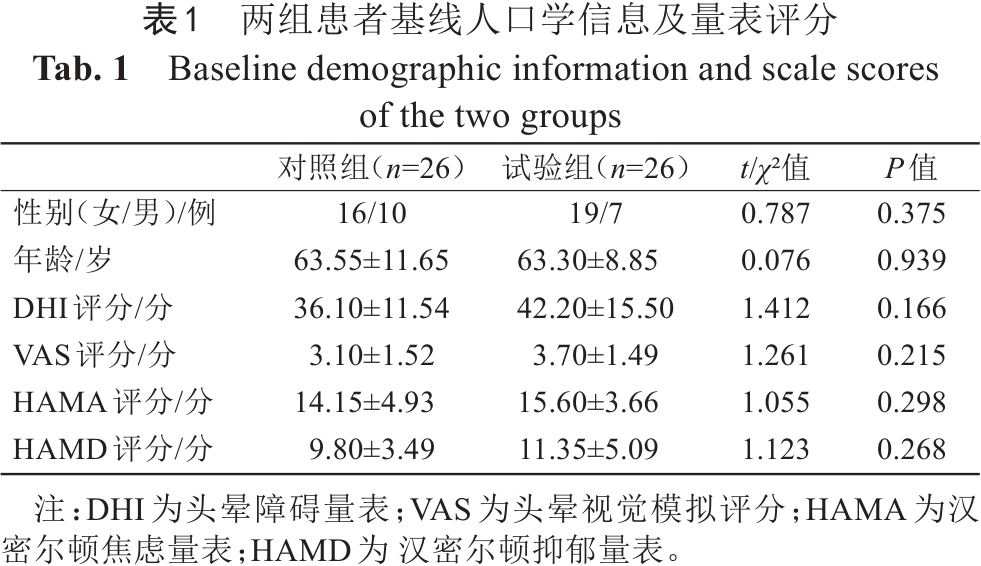 对照组患者中有2例被试拒绝行干预后的fMRI扫描,2例被试的fMRI数据头动过大(大于2 mm或2°),1例被试在研究期间私自进行前庭康复训练。试验组患者中有1例被试拒绝行干预后的fMRI扫描,1例被试的fMRI数据头动过大,1例被试fMRI数据配准欠佳,2例被试未能顺利完成连续14天的穴位贴敷联合耳穴压豆治疗。最终,本研究共纳入试验组和对照组患者各26例进行统计分析。