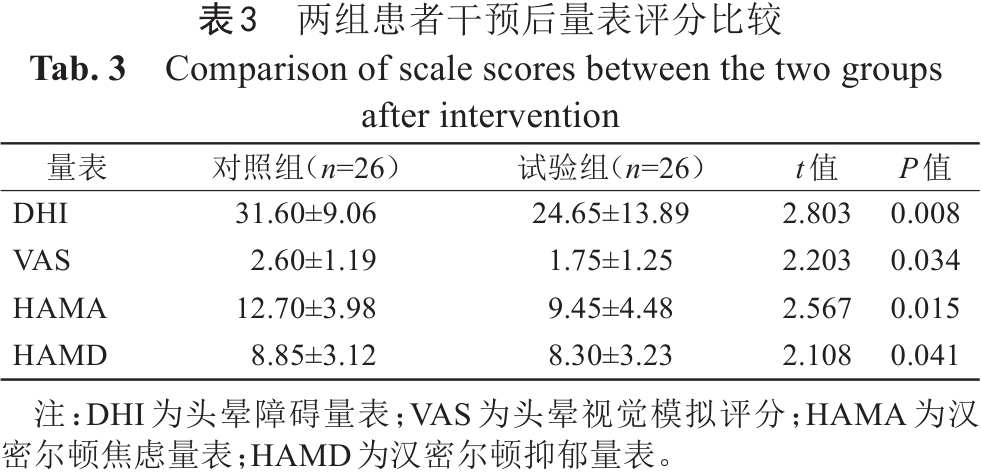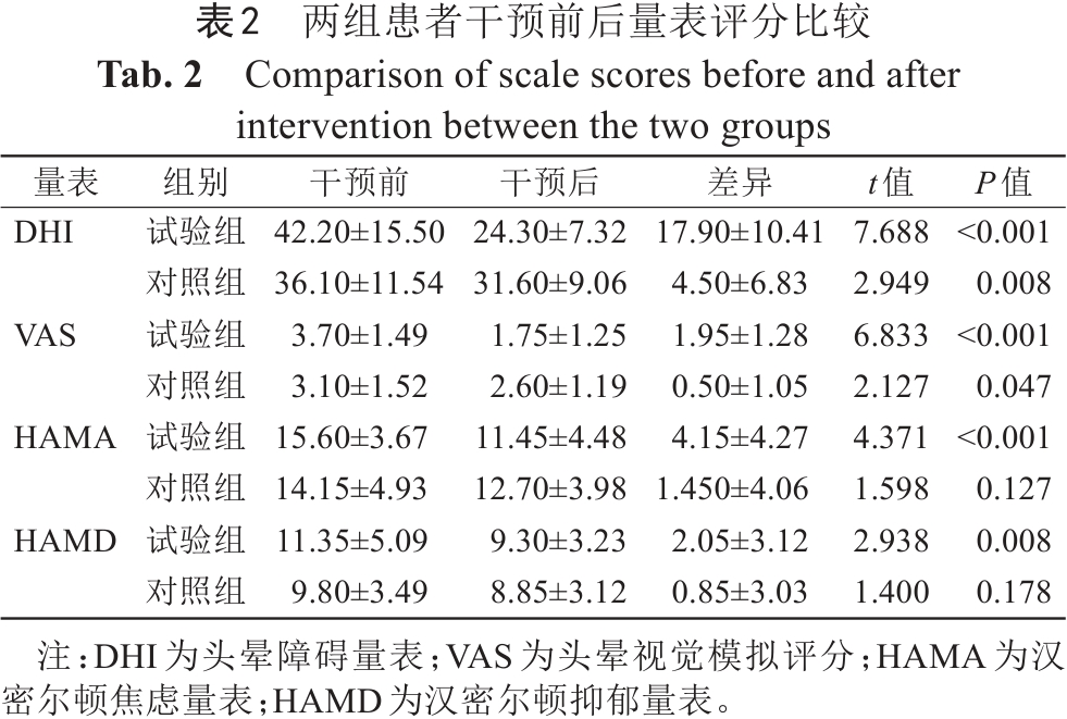 和对照组患者相比,试验组患者在性别、年龄及基线水平DHI、头晕VAS、HAMA及HAMD评分上差异无统计学意义(P>0.05),见表1。干预后,对照组患者DHI及头晕VAS评分显著低于基线水平(P<0.05), 而HAMA及HAMD评分治疗前后无显著统计学差异(P>0.05),见表2;干预后,试验组患者DHI、头晕VAS、HAMA及HAMD评分均显著低于基线水平(P<0.05),见表2;干预后,试验组患者DHI、VAS、HAMA及HAMD评分均显著低于对照组患者(P<0.05),见表3
