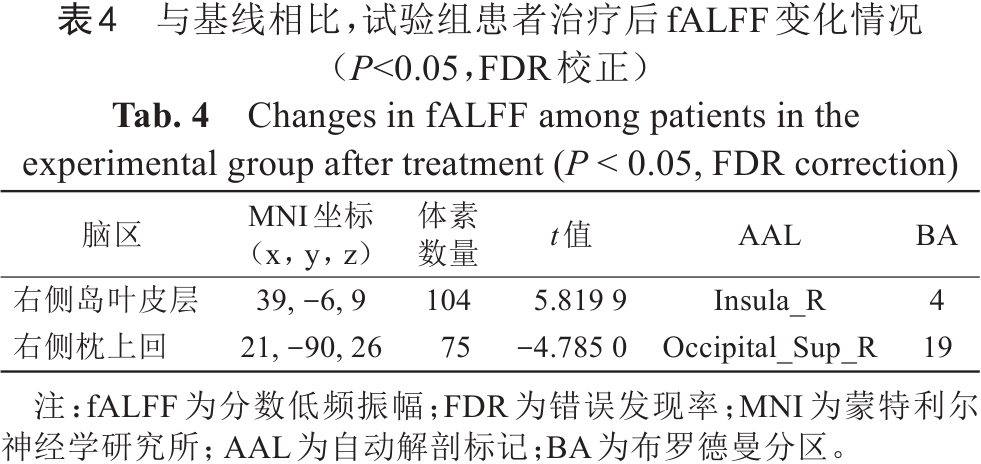 与基线相比,对照组患者治疗后未见fALFF显著增强或减弱的脑区。与基线相比,试验组患者治疗后,右侧岛叶皮层[MNI(39, -6, 9)对应BA4]区域的fALFF显著增强,右侧枕上回[MNI(21, -90, 26)对应BA19]区域的fALFF显著减弱(P<0.05,FDR校正),见表4图2图3