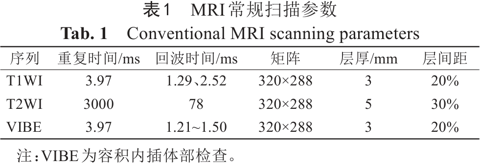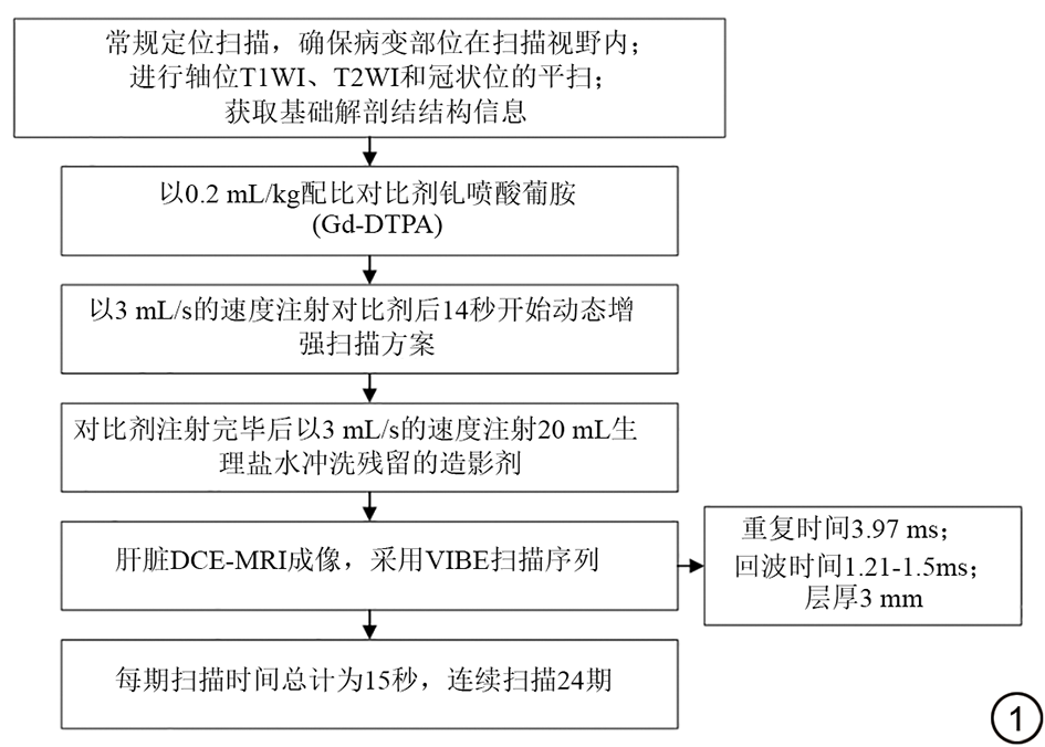 采用SIEMENS Prisma 3.0 T MRI(西门子医疗,德国)进行上腹部检查。检查前告知患者禁食、禁水4 h;按要求摘除身上的金属物品;指导患者仰卧于检查床,并训练患者跟随指令控制呼吸,告知患者检查过程中需要保持静止。对比剂使用钆喷酸葡胺注射液(商品名:莫迪司,上海博莱科信谊药业有限责任公司),药物浓度为529 mg/mL。MRI常规扫描参数及DCE-MRI扫描流程详见表1。常规平扫完成后行DCE-MRI扫描,扫描流程详见图1,其中每期扫描包括憋气口令6秒、单期扫描4秒、期相间休息5秒。结束后检查图像,保证图像清晰、符合诊断需求。