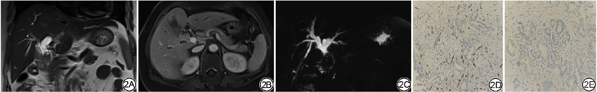 图2  男,45岁,肝外胆管癌,中分化。2A:冠状位T2WI;2B:轴位T1WI增强图像病灶强化较明显;2C:MRCP示胆总管内充盈缺损伴此水平以上肝内外胆管明显扩张;2D:微血管较丰富;2E:VEGF呈低表达。MRCP:磁共振胰胆管成像;VEGF:血管内皮生长因子。