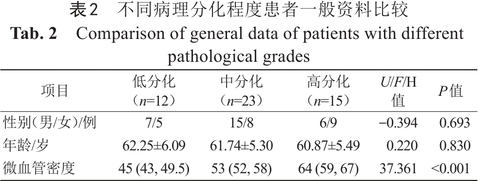 采用SPSS 27.0软件进行数据处理,符合正态分布且方差齐的计量资料用均数±标准差(x¯±s)表示,不符合正态分布的数据用中位数和上下四分位数MP25,P75)表示,计数资料采用频率n表示。计数资料组间比较采用Mann-Whitney U检验,计量资料组间比较采用单因素方差分析、Kruskal-Wallis H检验;采用Spearman检验分析计量资料与病理分化程度的组间相关性。P<0.05为数据差异具有统计学意义。