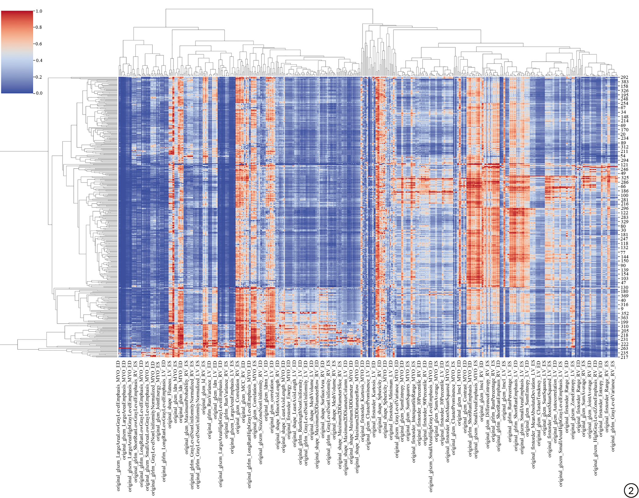 特征筛选分为三个阶段进行:首先,由两名具有5年以上CMR工作经验的影像医生在原生数据集中随机挑选50个数据进行重新分割,使用组内相关系数(intra-class correlation coefficient, ICC)评估观察者间一致性,仅有ICC>0.80的组学特征被纳入到后续分析中。而后使用最大相关性和最小冗余法(max-relevance and min-redundancy, MRMR)对特征子集中的所有特征进行筛选降维。为了确定训练队列中最具区分能力的影像组学特征,并在特征排序前去除不相关的特征,将特征筛选的显著性差异阈值设置为0.1,纳入P <0.1的特征。MRMR方法通过Python环境中的“scikit-learn”以及“pymrmr”实现。筛选过程中的聚类热图(Heat map)如图2所示。