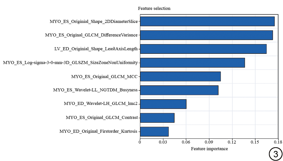 本研究存在有一定的局限性。首先,由于本研究仍属于单中心研究,且队列数量有限,因此模型的构建和训练全部采用适用于小样本队列的验证方法,后期有待进一步扩大队列患者数量,并进行进一步的外部验证工作。其次,纳入研究并用于进行模型构建的数据集全部基于HFrEF患者,因此,该模型在HFpEF患者中是否仍适用仍有待进一步验证。另外,本研究在模型构建并进行预测能力比较时,仅设置了三个分组,在后续工作中可增加与传统临床参数模型以及包含更多维度特征的模型之间的比较结果,以进一步挖掘多模态数据融合在预测模型构建方面的潜能。最后,虽然本研究在图像分割、特征提取以及分类器方法学上尽量追求模型鲁棒性与方法学创新的平衡,但本质上仍属于基于ML的传统影像组学研究范畴,目前基于DL的深度影像组学研究逐渐增多[39],未来可进一步将DL方法嵌合于组学模型架构当中。