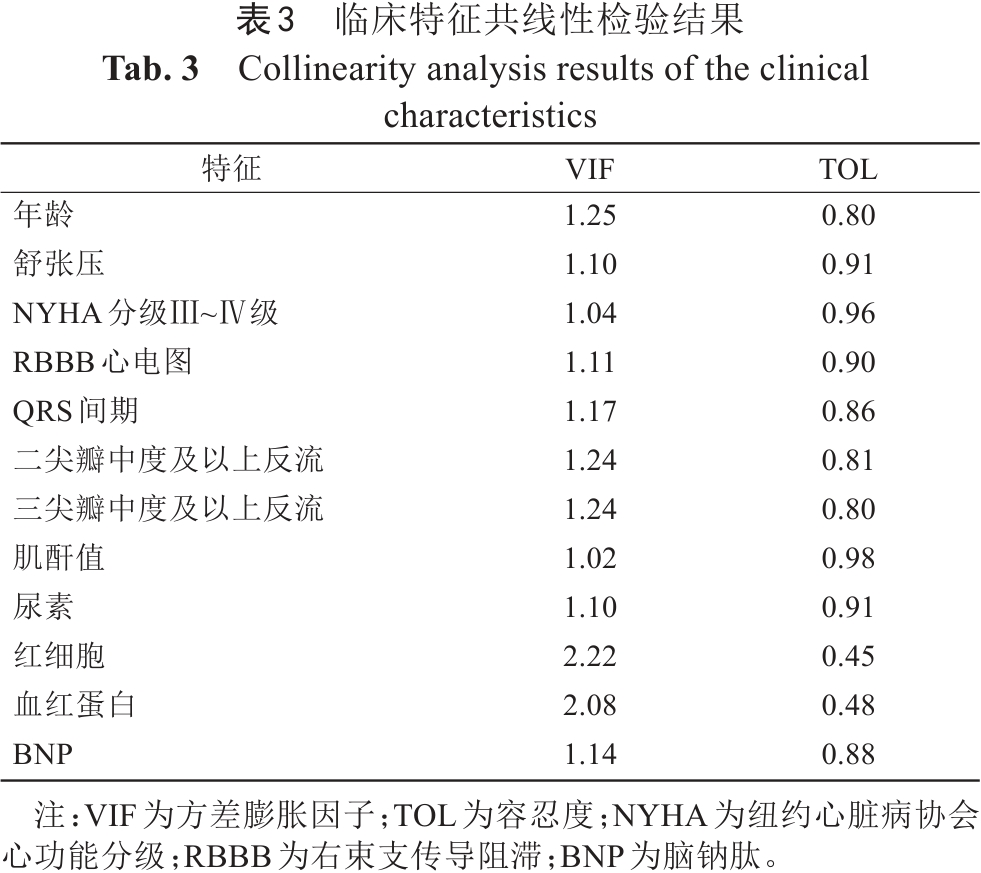 临床特征的单因素Cox回归分析结果如表2所示。在临床特征中,年龄(P=0.001)、NYHA分级Ⅲ~Ⅳ级(P<0.001)、RBBB心电图(P=0.037)、QRS间期(P<0.001)、二尖瓣中度及以上反流(P<0.001)、三尖瓣中度及以上反流(P=0.002)、肌酐值(P=0.019)、尿素(P<0.001)、红细胞(P=0.004)、血红蛋白(P=0.004)、BNP(P<0.001)共12个临床变量为HFrEF患者预后的独立预测因子。用于排除特征共线性的共线性检验结果如表3所示,所有纳入的特征其VIF均小于10,TOL均大于0.1,变量间不存在显著共线性,总体Kappa值为2.67,提示整体矩阵不存在显著共线性。经过筛选后的12个临床特征作为HFrEF患者预后相关的独立预测因子纳入建模。