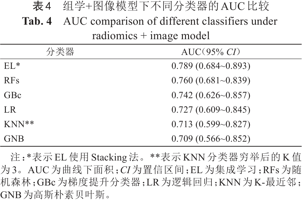 以组学+图像模型为例的分类器之间AUC效能比较如表4所示,在所应用的几种ML分类器中,基于Stacking方法的EL分类器取得了最佳的模型效能,AUC为0.789。