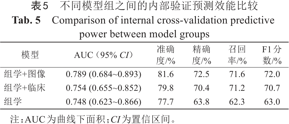 内部验证结果显示,在所有模型中,组学+图像模型达到了相对最好的模型预测效能(图4),AUC为0.789(95% CI:0.684~0.893),准确度为81.6%,精确度为72.5%,召回率为71.6%,F1分数为72.0%。其次为组学+临床模型,AUC为0.754(95% CI:0.655~0.852),准确度为79.8%,精确度为70.4%,召回率为71.2%,F1分数为70.7%。单纯使用组学的模型效果相对最差,AUC为0.748(95% CI:0.623~0.866),准确度为77.7%,精确度为63.8%,召回率为62.3%,F1分数为63.0%。不同模型之间的预测效能比较如表5所示。DeLong检验结果显示,组学+图像模型与组学+临床模型以及单纯组学模型之间的AUC差异具有统计学意义(组学+图像模型比组学+临床模型,P=0.037;组学+图像模型比单纯组学模型,P=0.022),而组学+临床模型与单纯组学模型之间的AUC差异不具有统计学意义(P=0.154)。