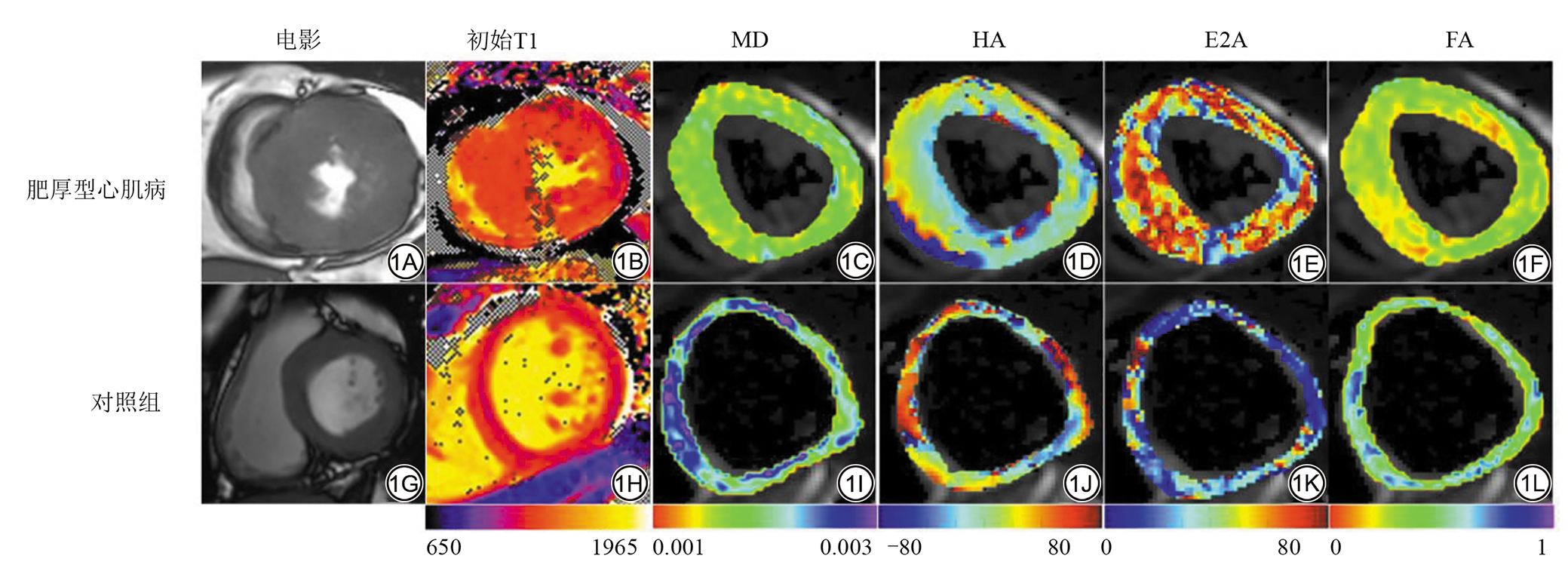 Fig. 1  Cardiac diffusion tensor imaging and conventional imaging examples. 1A to 1F show a 72-year-old female with hypertrophic cardiomyopathy, mid-ventricular short-axis views: cine imaging (1A), native T1 mapping (1B), decreased MD (1C), HA (1D), increased E2A (1E), decreased FA (1F). 1G to 1L show an 18-year-old healthy male volunteer, mid-ventricular short-axis views: cine imaging (1G), native T1 mapping (1H), MD (1I), HA (1J), E2A (1K), FA (1L). MD: mean diffusivity; HA: helix angle; E2A: secondary eigenvector angle; FA: fractional anisotropy.