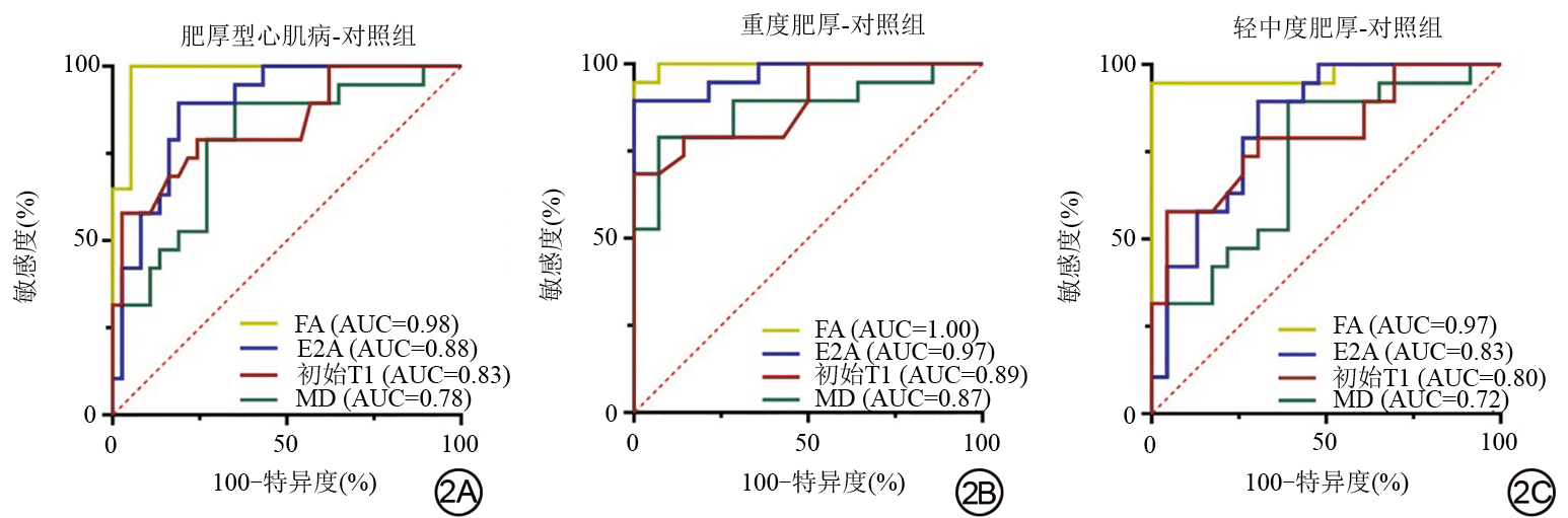 图2  关于心脏弥散张量成像参数以及初始T1 值对HCM患者(2A)及不同肥厚程度HCM患者(2B~2C)的诊断效能的受试者工作特征曲线分析。FA:各向异性分数;E2A:次要特征向量角;MD:平均弥散率;AUC:曲线下面积。