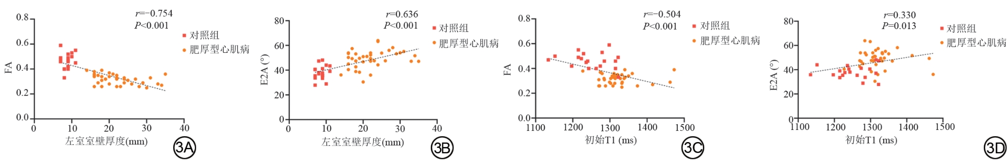 图3  心脏弥散张量成像参数与左室室壁厚度(3A~3B)及初始T1(3C~3D)的线性相关分析。FA:各向异性分数;E2A:次要特征向量角。