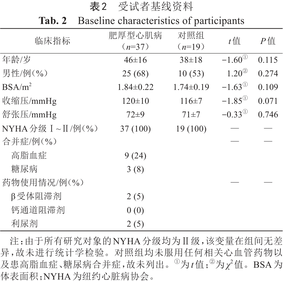 本研究最终纳入37例HCM患者,男25例、女12例,年龄(46±16)岁;纳入19例对照,男10例、女9例,年龄(38±18)岁。两组BSA、收缩压、舒张压以及纽约心功能分级的差异无统计学意义(P>0.05)。受试者基线资料详见表2