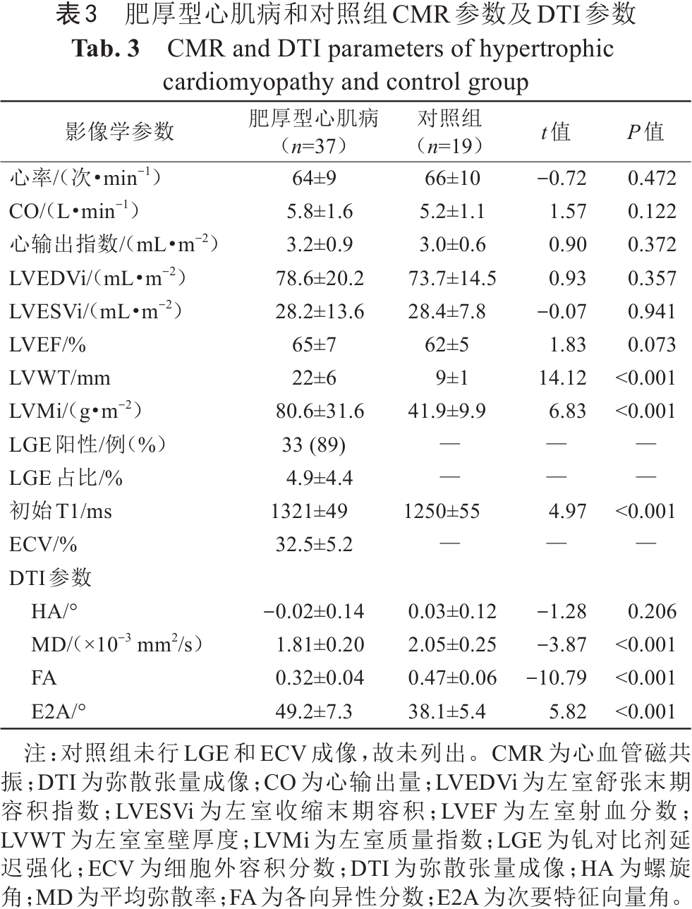 表3  肥厚型心肌病和对照组CMR参数及DTI参数