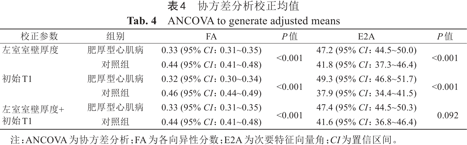 协方差分析的结果显示(表4):在校正了LVWT和初始T1影响后,FA在HCM患者和对照组间的差异仍具有统计学意义(P<0.001)。校正后的E2A在HCM患者和对照间之间的差异不再具有统计学意义(P=0.092)。