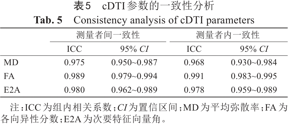 关键cDTI参数具有极好的测量者间和测量者内的一致性,结果如表5所示。MD、FA和E2A三个参数,无论是测量者间还是测量者内比较,其ICC均高于0.9。