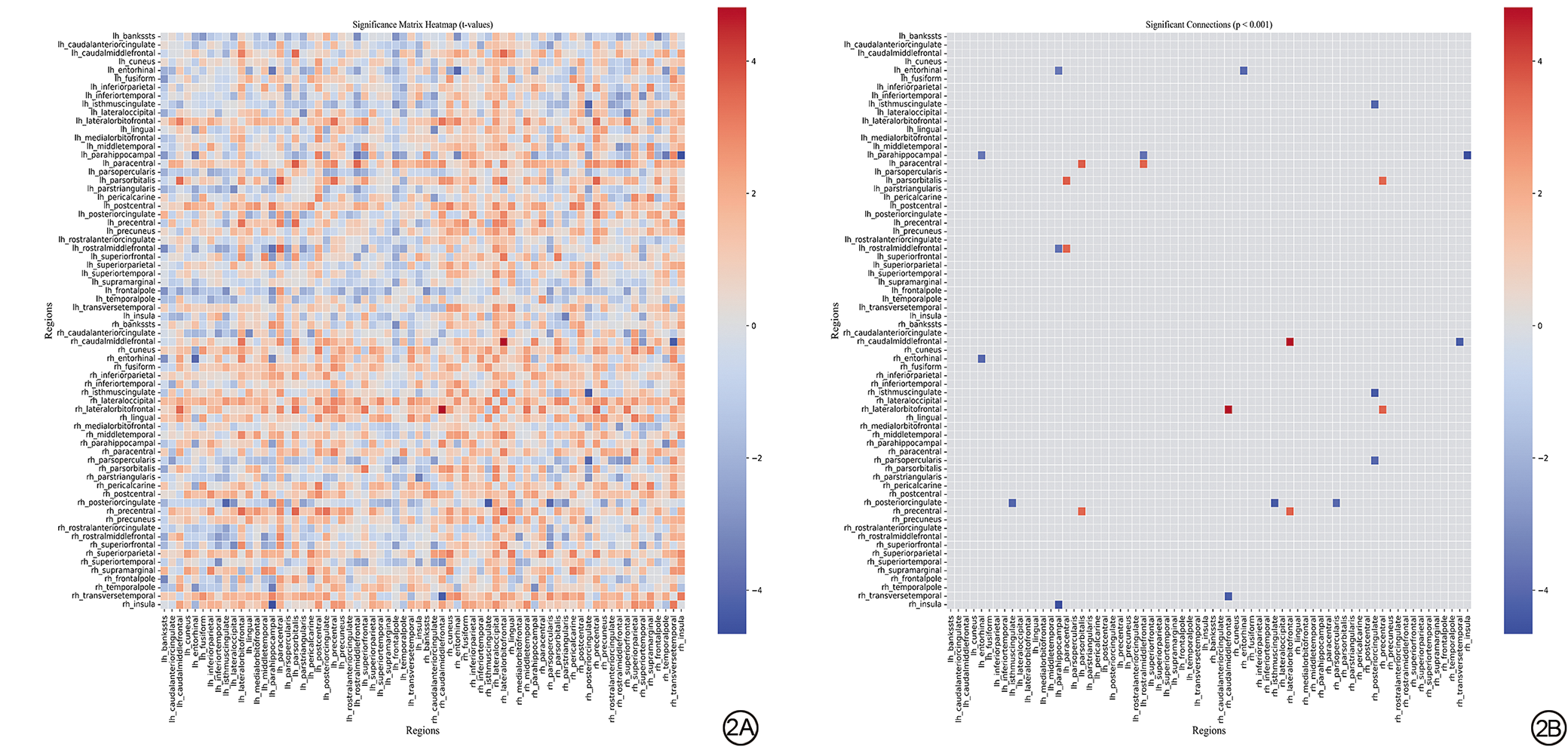 图2  基于皮层表面积的全脑区连接t值矩阵及显著连接t值矩阵。2A展示了基于皮层表面积的全脑区连接t值矩阵,颜色表示各脑区之间连接的t值大小,红色表示正向关联,蓝色表示负向关联;2B展示了筛选出P<0.001的显著脑区连接t值矩阵,仅显示统计上显著的正向(红色)和负向(蓝色)连接。