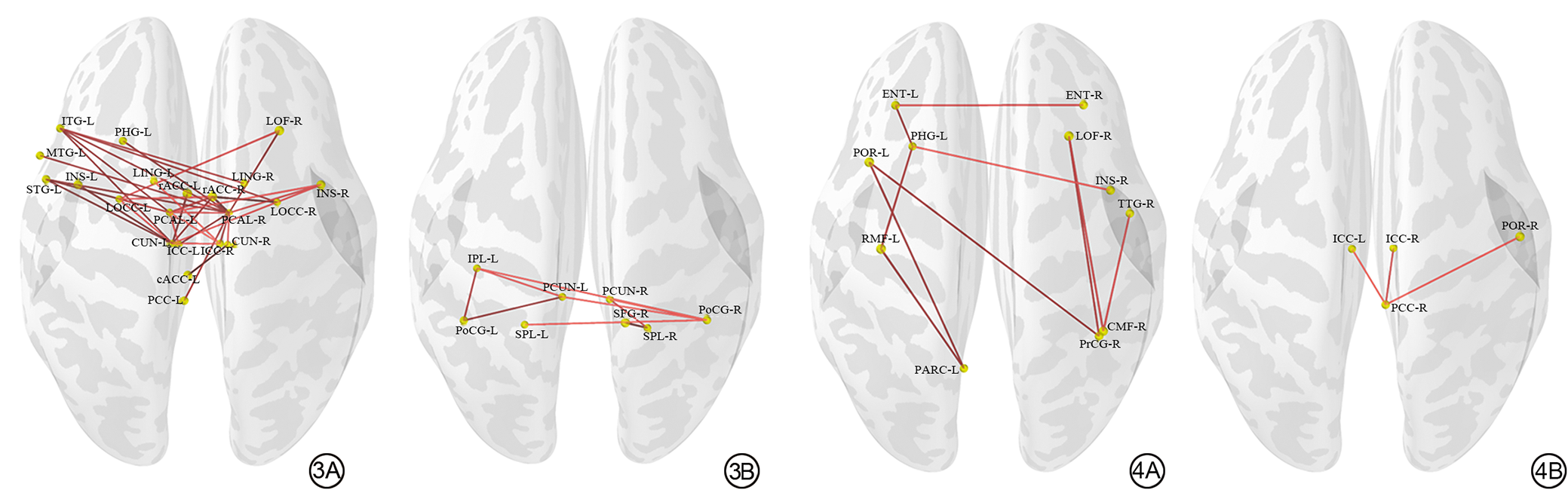 Fig. 3  Individual structural covariance network distribution based on cortical thickness. 3A: Component 1; 3B: Component 2. R: right; L: left; ITG: inferior temporal gyrus; MTG: middle temporal gyrus; STG: superior temporal gyrus; INS: insula; PHG: parahippocampal gyrus; LOCC: lateral occipital cortex; LING: lingual gyrus; rACC: rostral anterior cingulate cortex; PCAL: pericalcarine; CUN: cuneus; ICC: isthmus cingulate cortex; cACC: caudal anterior cingulate cortex; PCC: posterior cingulate cortex; LOF: lateral orbitofrontal cortex; IPL: inferior parietal lobule; PoCG: postcentral gyrus; SPL: superior parietal lobule; PCUN: precuneus; SFG: superior frontal gyrus.