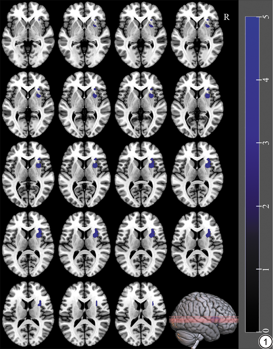基于团块水平的分析结果显示,与HC相比,MDD伴NSSI的患者的右侧壳核、右侧岛叶的CBF值下降(P<0.05,FWE校正,t=4.9)。如图1所示。