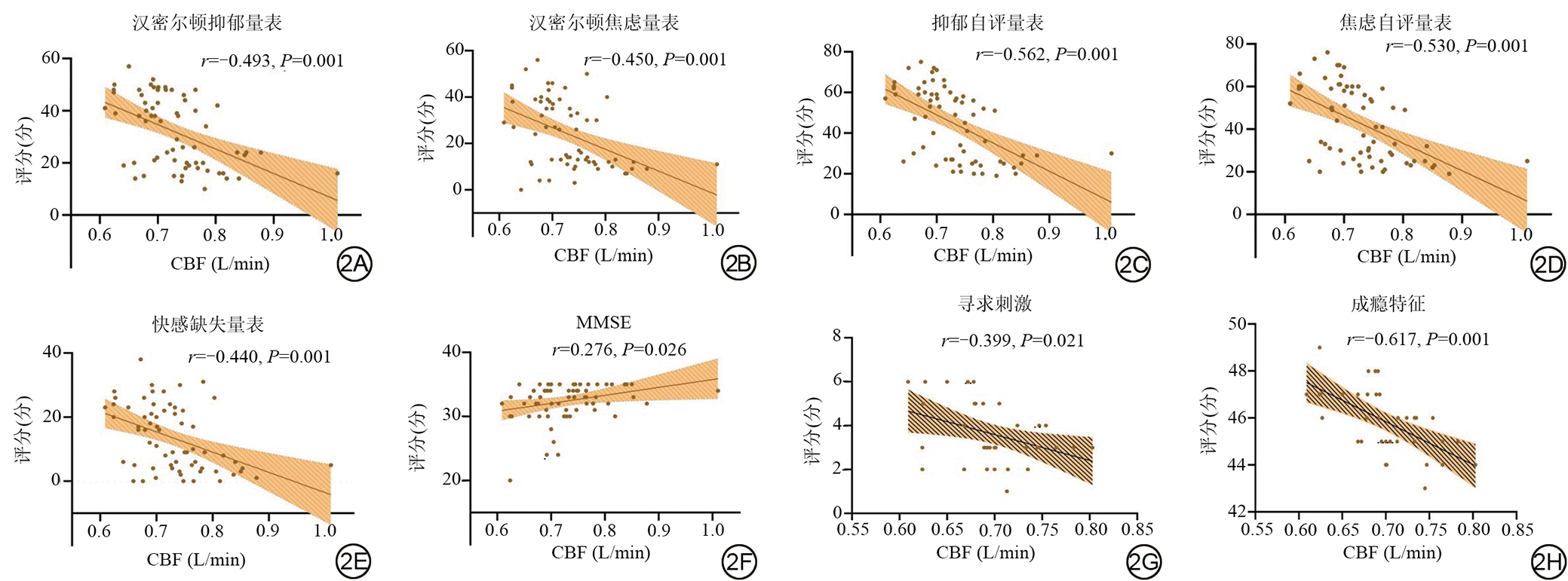 图2  CBF值的变化与疾病相关人口学特征之间的相关性。2A~2E:显著脑区CBF值与汉密尔顿抑郁量表、汉密尔顿焦虑量表、抑郁自评量表、焦虑自评量表以及快感缺失量表评分均呈负相关;2F:与MMSE量表评分呈正相关;2G~2H:渥太华自伤量表中的成瘾特征及寻求刺激呈负相关。CBF:脑血流量;MMSE:简易精神状态检查量表。