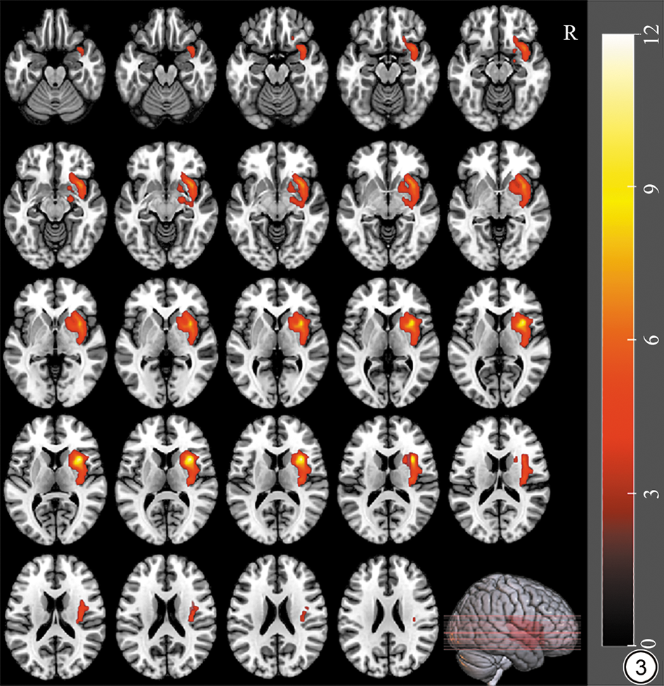 Fig. 3  The CBF positive connection of the right putamen and the whole brain voxels of major depressive disorder accompanied by non-suicidal self-injury patients. CBF: cerebral blood flow.