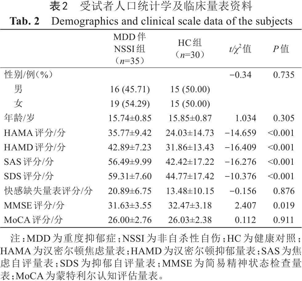 本研究前瞻性纳入了2023年12月至2024年11月在兰州大学第二医院就诊并诊断为MDD伴NSSI的青少年患者35例,其中男11例,女24例。通过广告方式招募与NSSI患者性别、年龄相匹配的健康青少年30例作为健康对照(healthy control, HC)组。本研究遵守《赫尔辛基宣言》,经过兰州大学第二医院伦理委员会批准,批准文号:2023A-275。全体受试者均签署了知情同意书。