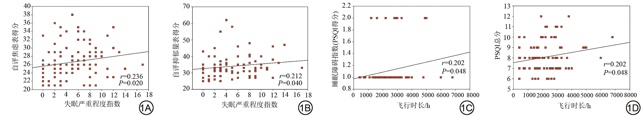 图1  相关性分析。1A:失眠严重程度指数与自评焦虑量表评分的相关关系;1B:失眠严重程度指数与自评抑郁量表评分的相关关系;1C:睡眠障碍指数与飞行时长的相关系数;1D:PSQI总分与飞行时长的相关系数。PSQI:匹兹堡睡眠质量指数。