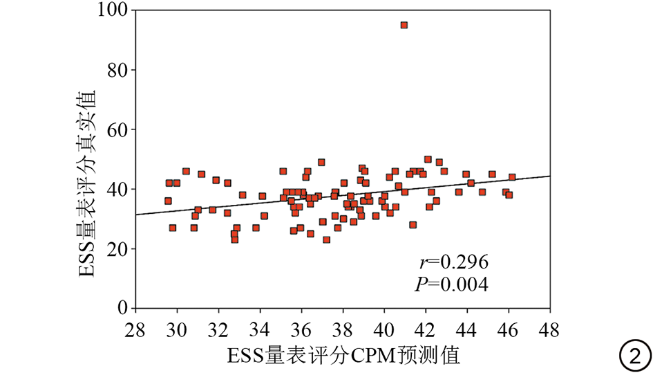基于CPM模型的ESS预测值与其真实值之间存在相关关系(r=0.296),且置换检验表明该相关性具有统计学意义(P=0.004)(图2)。