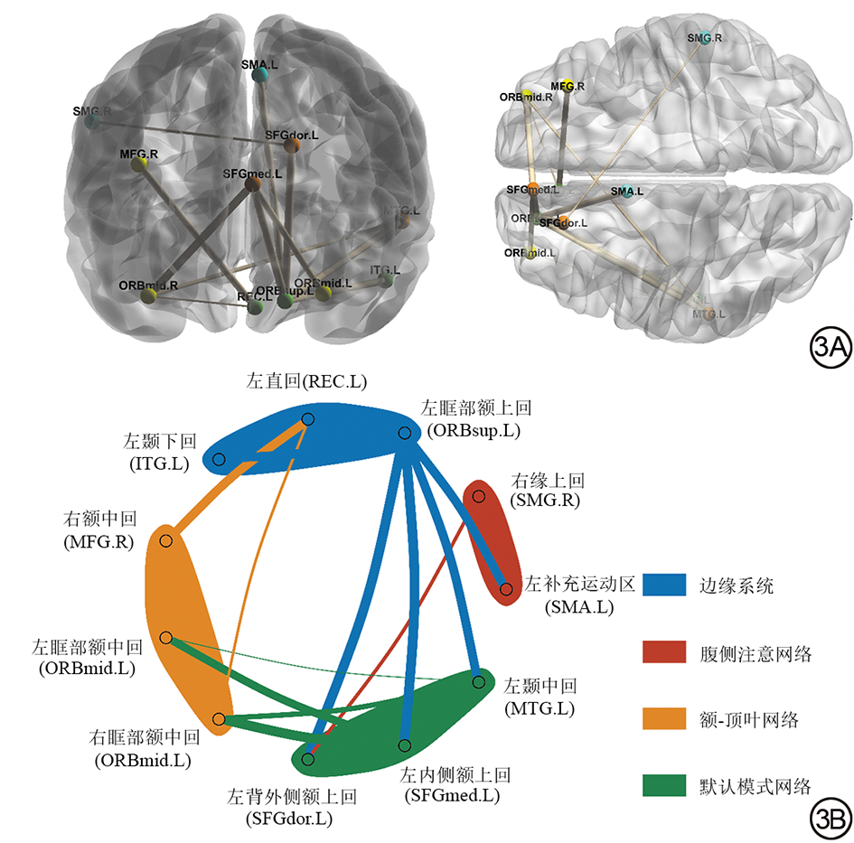 具有主要贡献的功能连接(图3A表2)为左眶部额上回(left orbital part of superior frontal gyrus, ORBsup.L)与左背外侧额上回(left dorsolateral superior frontal gyrus, SFGdor.L)、左内侧额上回(left medial superior frontal gyrus, SFGmed.L)、左颞中回(left middle temporal gyrus, MTG.L)、左颞下回(left inferior temporal gyrus, ITG.L)及左补充运动区(left supplementary motor area, SMA.L)之间的功能连接,以及左直回(left rectus gyrus, REC.L)与右额中回(right middle frontal gyrus, MFG.R)之间的功能连接、SFGmed.L与双侧眶部额中回(ORBmid.L、ORBmid.R)之间的功能连接。网络归类以后,主要具有主要贡献的功能连接主要存在于边缘系统与默认模式网络、腹侧注意网络、额顶叶网络之间(图3B)。