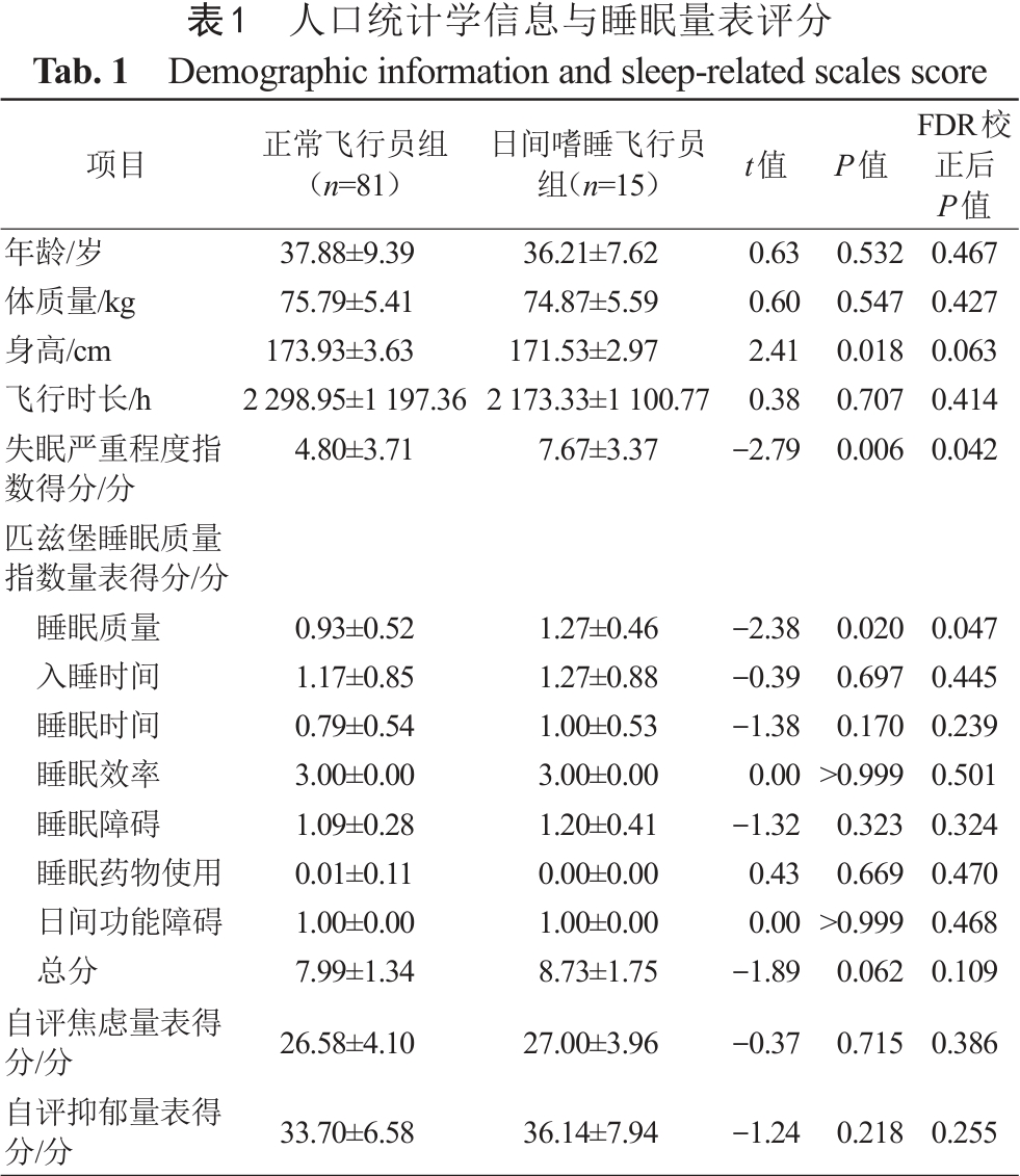 嗜睡组飞行员失眠程度(ISI得分)显著高于正常组飞行员(P=0.006,FDR校正后P=0.042),睡眠质量(PSQI得分)低于正常组飞行员的趋势(P=0.020,FDR校正后P=0.047)。两组间焦虑与抑郁水平差异无统计学意义(P>0.05)。详见表1