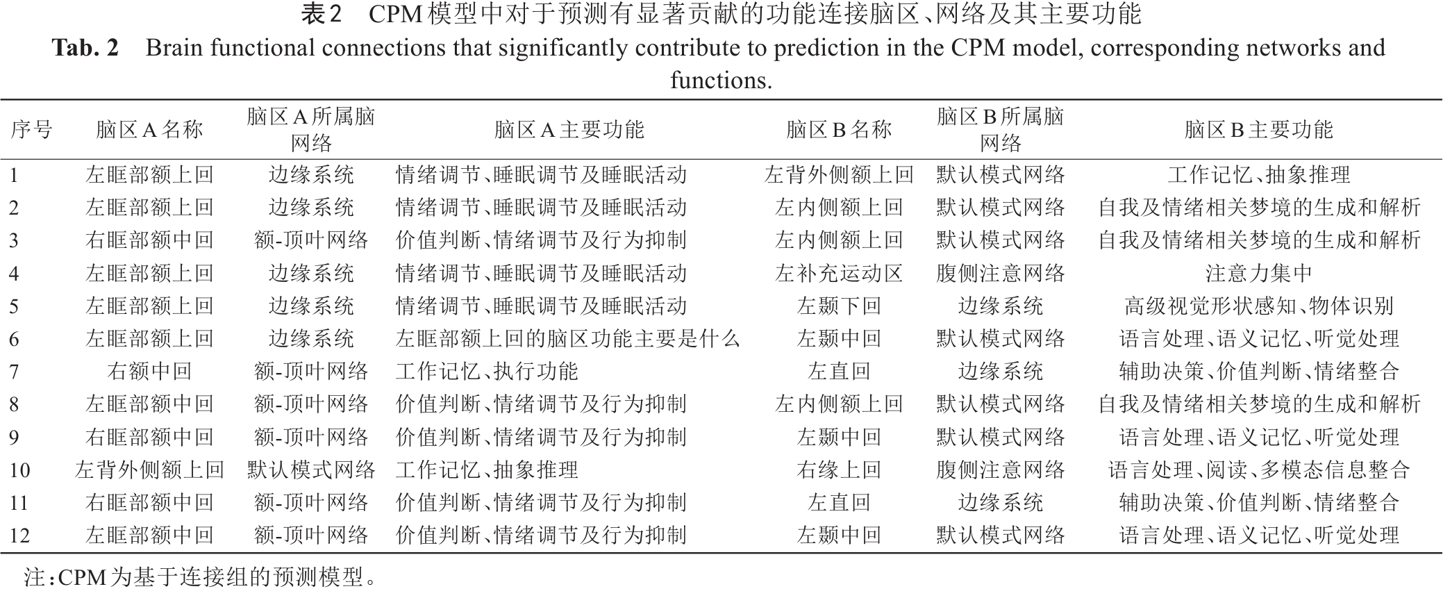 表2  CPM模型中对于预测有显著贡献的功能连接脑区、网络及其主要功能