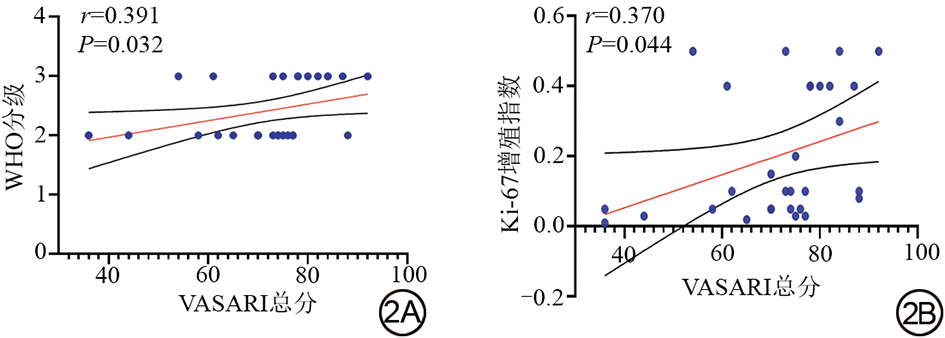 图2  VASARI总分与WHO分级(2A)及Ki-67增殖指数(2B)的相关性散点图。VASARI总分与WHO分级及Ki-67增殖指数呈正相关。VASARI:伦勃朗视觉感受图像。