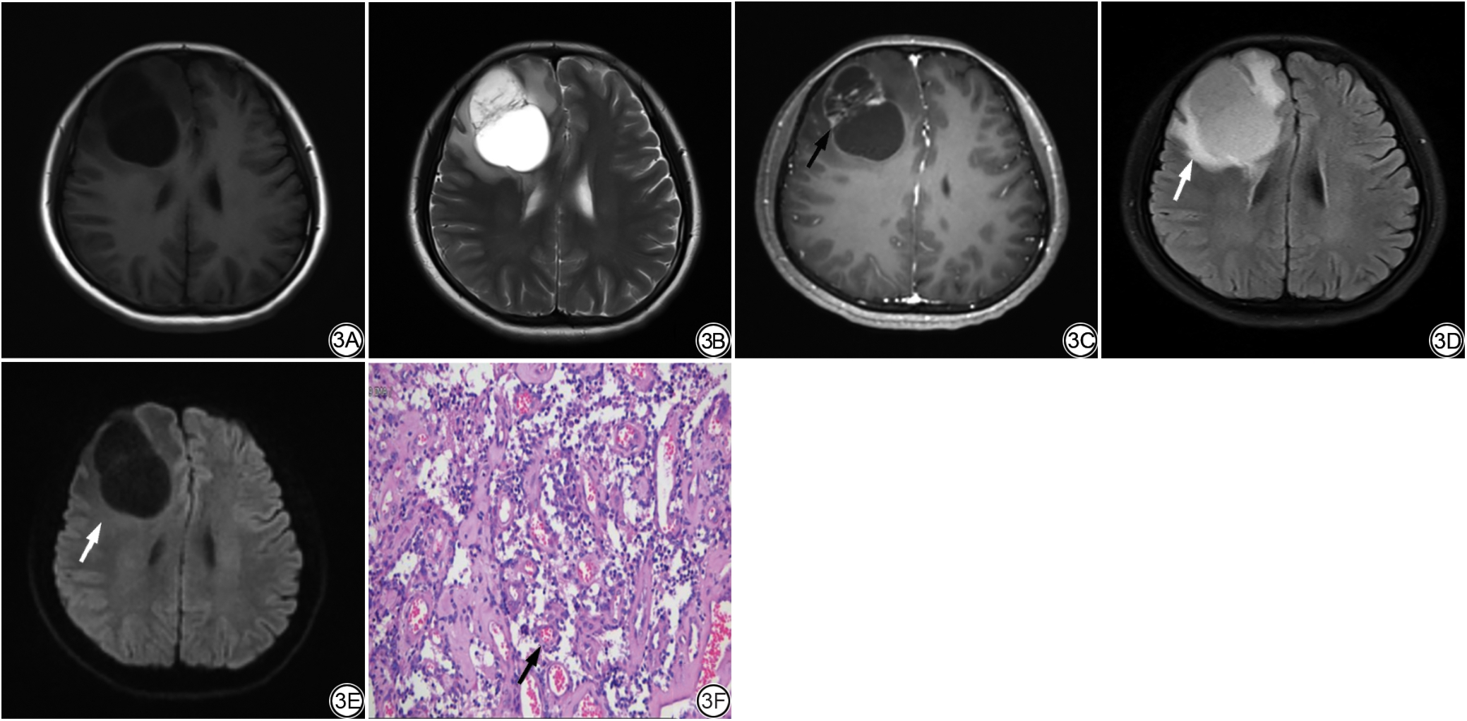 Fig. 3  Female, 17 years old, with right frontal lobe IEE, WHO Grade 2, Ki-67 proliferation index 5% (low expression), and a VASARI total score of 70. 3A-3B: T1WI and T2WI images show a cystic lesion with long T1 and long T2 signalintensity, clear margins, and heterogeneous signal. Multiple linear septations are visible within the lesion. 3C: CE-T1WI image demonstrates enhancement of the tumor cyst wall and internal septations, with no enhancement of the cyst contents. The thickness of the enhancing margin (F11, arrow) is thin (3 points). 3D-3E: FLAIR and DWI images reveal diffuse patchy edema around the tumor. The edema appears hyperintense on FLAIR and isointense on DWI. The percentage of peritumoral edema (F14, white arrow) is 34%-67% (5 points). 3F: Histopathological image (HE × 200) shows tumor cells arranged radially around blood vessels, forming pseudorosette structures (black arrow). IEE: intracranial extraventricular ependymoma; VASARI: visually accessible Rembrandt images; CE-T1WI: contrast-enhanced T1-weighted imaging; FLAIR: fluid-attenuated inversion recovery; DWI: diffusion-weighted imaging.