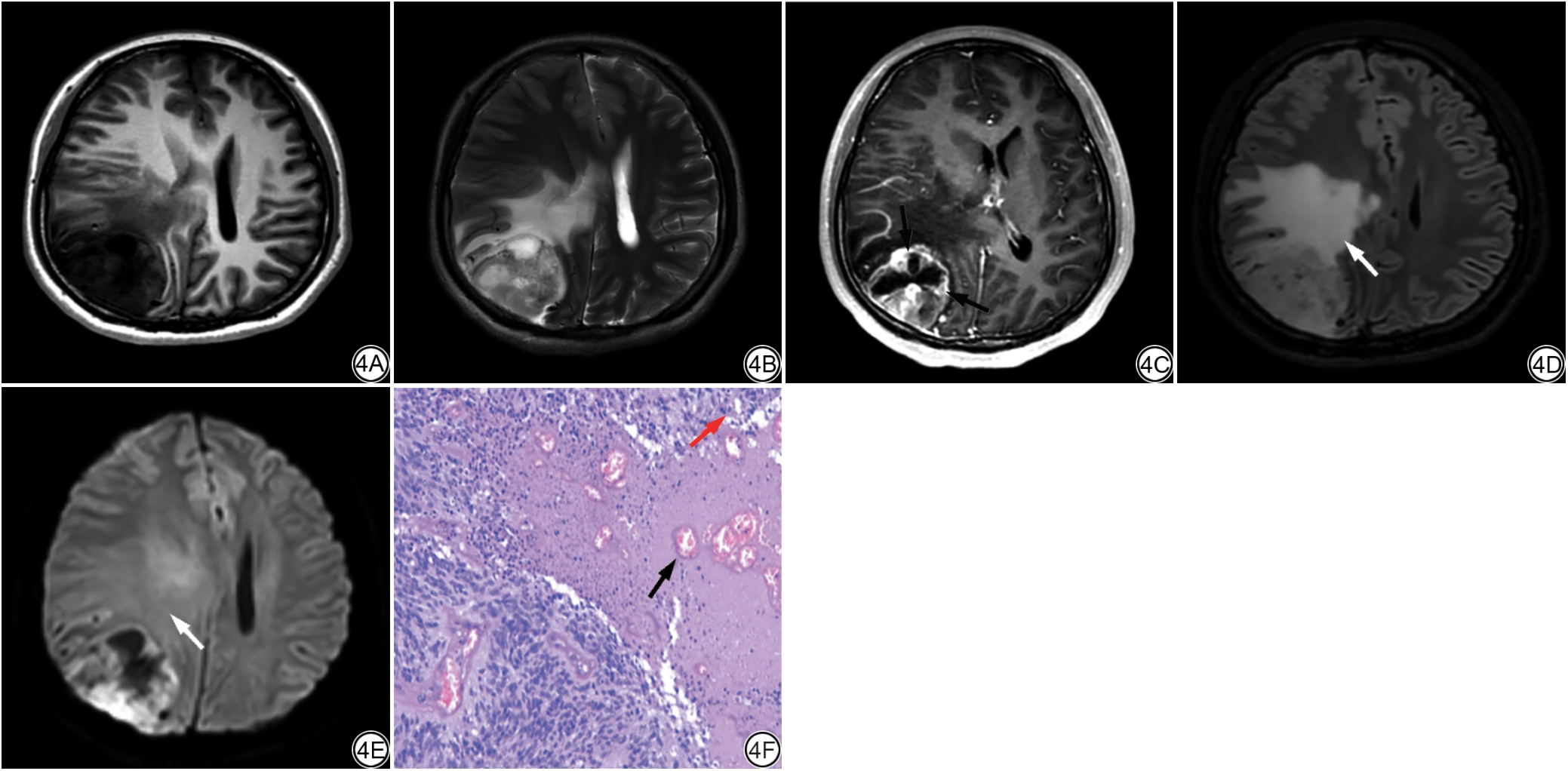 图4  女,20岁,左侧顶叶IEE,WHO分级3级,Ki-67增殖指数40%(高表达),VASARI总分为87。4A~4B分别为T1WI、T2WI图像,病灶呈多囊囊实性,T1WI呈等稍高信号影伴内部低信号区,T2WI示中央呈高信号、外周呈稍高信号;4C:CE-T1WI图像,病灶呈不均匀花环形强化,强化边缘(F11,箭)厚度为厚(4分);4D~4E分别为FLAIR、DWI图像,瘤周较大范围不规则水肿影,FLAIR呈高信号,DWI呈等信号,瘤周水肿(F14,白箭)百分比为68%~95%(6分);4F:病理图(HE ×200)可见肿瘤细胞呈放射状排列环绕血管生长,形成假菊形团结构(黑箭)及真菊形团结构(红箭),肿瘤细胞排列密集,胞核增大,异型性明显,中央可见大范围坏死区(均匀粉染区域)。IEE:颅内脑室外室管膜瘤;VASARI为伦勃朗视觉感受图像;CE-T1WI:增强T1加权成像;FLAIR:液体衰减反转恢复成像;DWI:弥散加权成像。