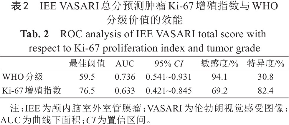 表2  IEE VASARI总分预测肿瘤Ki-67增殖指数与WHO分级价值的效能