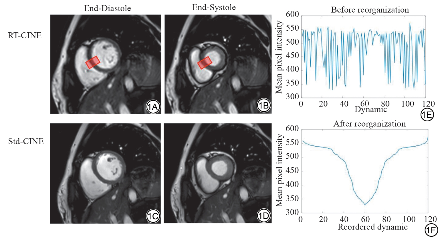 图1  RT CINE 和Std CINE 在舒张末期及收缩末期的典型图片及ROI 勾画示意图,来自志愿者男,54 岁。1A:RT CINE 记录的舒张末期心室状态,图中的红色框显示了跨室间隔的ROI,收集心肌信号和血池信号;1B:RT CINE 记录的收缩末期心室状态;1C:Std CINE 获取的舒张末期心室状态;1D:Std CINE 获取的收缩末期心室状态;1E:排序前ROI 中120 个相位的信号变化曲线;1F:排序后,RTCINE 可以恢复心室收缩舒张期曲线,用于心室功能评估。RT CINE:自由呼吸实时电影,Std CINE:标准屏气电影,ROI:感兴趣区。