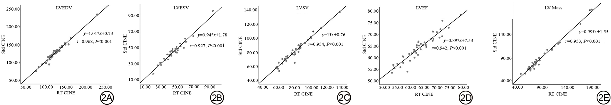 图2  RT CINE和Std CINE的相关性分析。EDV、ESV、EV、EF和MASS等参数显示出高度相关性。RT CINE:实时电影;Std CINE:标准屏气电影;EDV:舒张末期容积;ESV:收缩末期容积;SV:每博输出量;EF:左心射血分数;MASS:心肌质量。