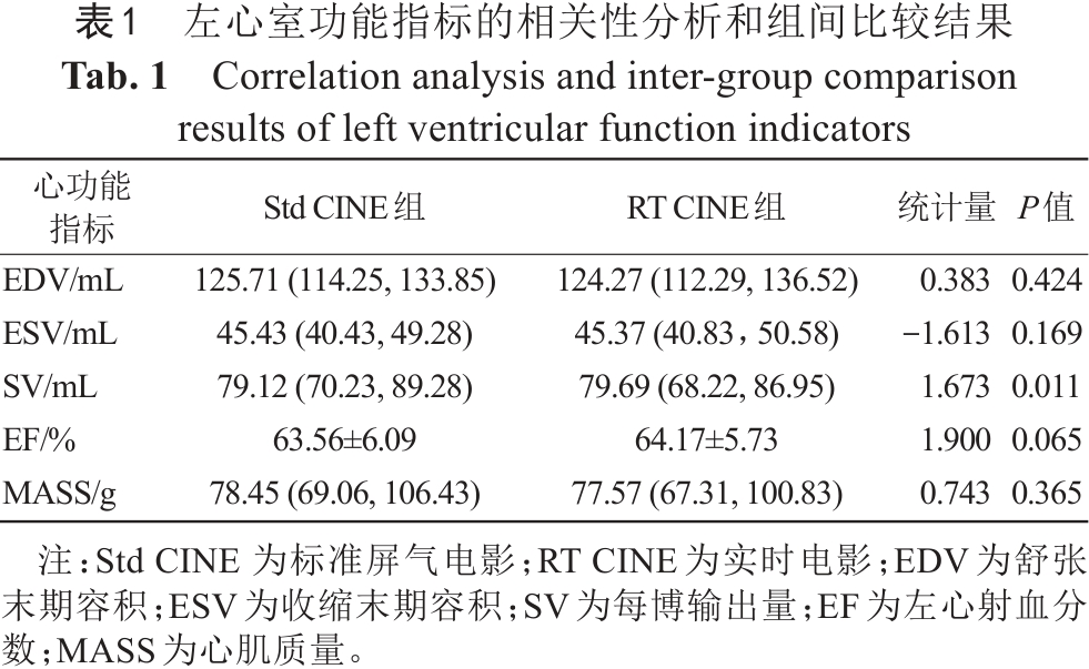 邀请两位10年以上MRI诊断经验的副主任医师进行图像质量主观评价,在双盲的情况下对屏气Std CINE和RT CINE图像质量给出分值。评价标准[17]为:噪声过多,心肌血池对比度差,伪影严重,无法用于心脏功能检查分析,不能诊断需求,1分;噪声过多,心肌血池对比度较差,伪影比较严重,可用于心脏功能检查分析,但会影响诊断,2分;噪声可接受,心肌血池对比度可,伪影尚可,可用于心脏功能检查分析,不影响诊断,3分;噪声较少,心肌血池对比度较好,伪影很少,可用于心脏功能检查分析,可以准确诊断,4分;噪声少,心肌血池对比度高,可用于心脏功能检查分析,可以快速诊断,5分。为精准评估两组图像质量,主观评价分值在上述标准基础上采用连续变量。取两位医师主观评价平均分为单一图像的主观分值。