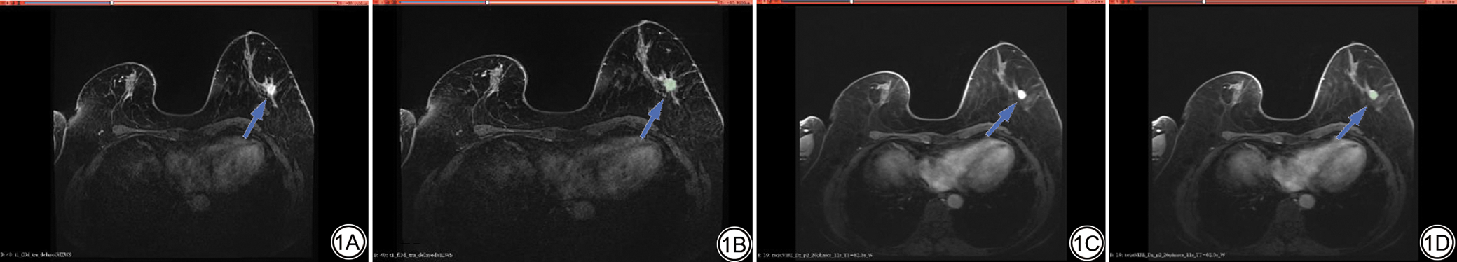 图1  靶区勾画图。女,56岁,非特殊型浸润性乳腺癌。1A:患者高分辨率延迟期原始病灶图;1B:高分辨率延迟期靶区勾画图。1C:患者动态对比增强原始病灶图;1D:动态对比增强图靶区勾画图。人工逐层勾画病灶(蓝箭)边缘,勾画时避开水肿区域、血管及正常组织。