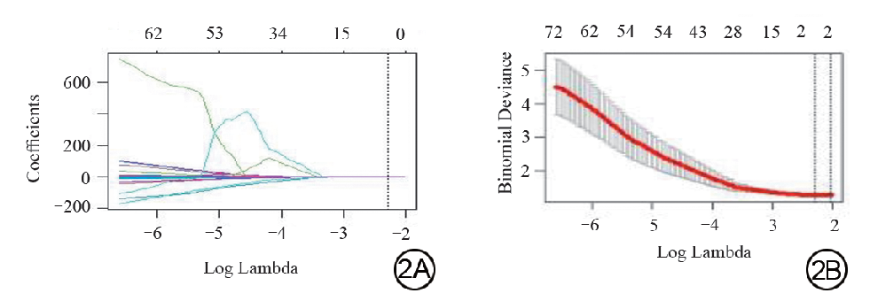 图2  动态对比增强影像组学特征的特征选择图。2A:图中曲线代表特征的变化轨迹,黑色垂直线定义了λ的最佳值为0.093。2B:左侧和右侧的虚线分别代表二项式偏差最小模型原则和距离二项式偏差最小值的一个标准差范围内的最简洁模型原则,本研究中采用最小模型原则。