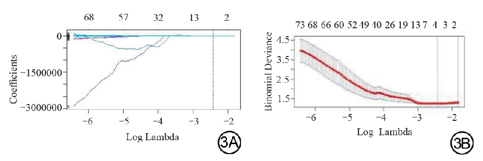 Fig. 3  Feature selection map of high-resolution delayed-period radiomics features. 3A: the curve represents the trajectory of feature changes, with the black vertical line indicating the optimal λ value of 0.088. 3B: the dashed lines on the left and right correspond to the principle of the minimum model under binomial deviance and the principle of the most parsimonious model within one standard deviation of the minimum binomial deviance, respectively; this study adopted the minimum model principle.