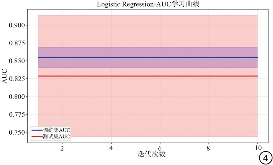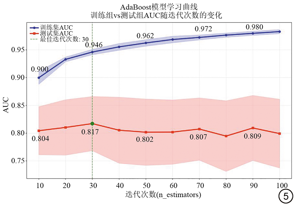 图5  AdaBoost联合模型在训练集和测试集的AUC曲线随迭代次数变化图。AUC:曲线下面积。