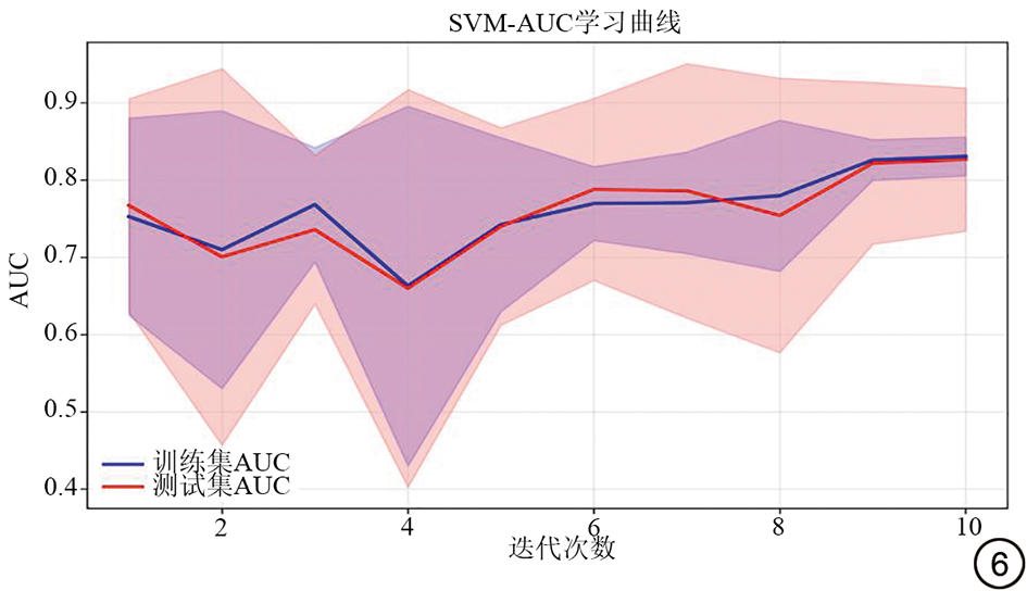 图6  SVM联合模型在训练集和测试集的AUC曲线随迭代次数变化图。AUC:曲线下面积。