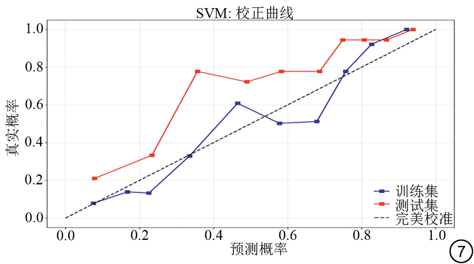 图7  基于DCE特征-高分辨率延迟期特征-临床特征的支持向量机联合模型校正曲线。蓝色实线代表训练集校正曲线,红色实线代表测试集校正曲线。黑色虚线代表理想线。蓝色和红色实线越接近红色虚线代表模型的预测概率与实际发生概率相匹配。DCE:动态对比增强。